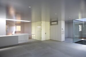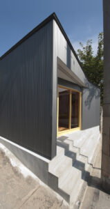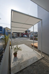 大須のビルの一角にあった地図専門店の移転。 旧店舗の内外建具、内装材、設備機器など取り外し可能な部材はすべて再利用した。 新店舗はT字路の突き当りにあり、都市に窪みをつくるようにエントランスポーチをつくり、そのスペースで敷地の高低差を解消し、シャッターボックスを内包した。