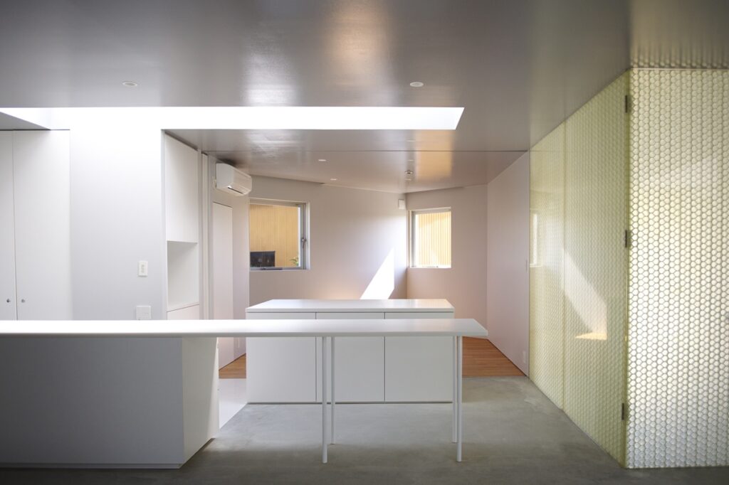 郊外の田んぼ1反分の広い敷地に対して、安心感とコンパクトな生活動線が求められた。 外周はRCの壁で閉鎖的な表情だが、内部には3つの光庭があるため、明るさが広がり、風が抜ける。 部屋同士をつなぐ廊下や壁は少なく、光庭によって空間を分け、回遊性を生み出している。 光庭カーテンなどを開けているときは家全体に視線が広がり、奥行が生まれる。 カーテンを閉めれば、容易にプライバシーを保つこともできる。 内部のプランは都市のグリッドに対し、45度の角度を振ったグリッドで構成されている。 外周部に現れたギザギザが耐力壁を増やし、内部では方位感覚を惑わすことで感覚を研ぎ澄ませる。