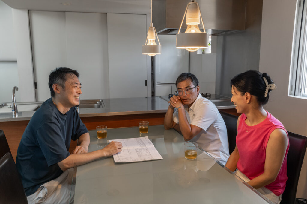 立位のキッチンや椅子座のダイニングと床座やソファ座のリビングとは目線の高さが合う。掘りごたつ式のスタディコーナーからはリビングに座る人の頭を越えて、南の大開口がのぞめる。