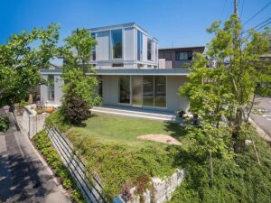北側には親族が所有するアパートがあるため、影を落とさないように南側に寄せて建てられ、ヴォリュームも南側が高く北側が低い。大開口がある南側リビングはプライバシーを確保するためにGLから2mほど上がっている。東側もアパート駐車場の出入りがあるためダイニングキッチンのレベルを1.2m上げている。